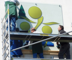 und witterungsbeständig auf eine Scheibe aus Sicherheitsglas appliziert.